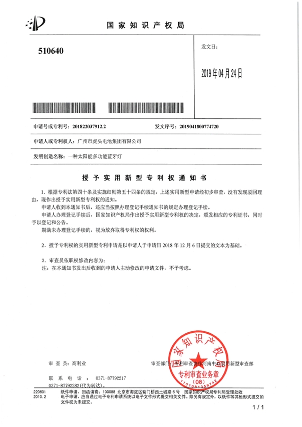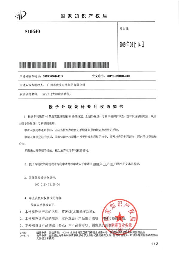 • 蓝牙灯(太阳能多功能)获国家外观设计专利授权