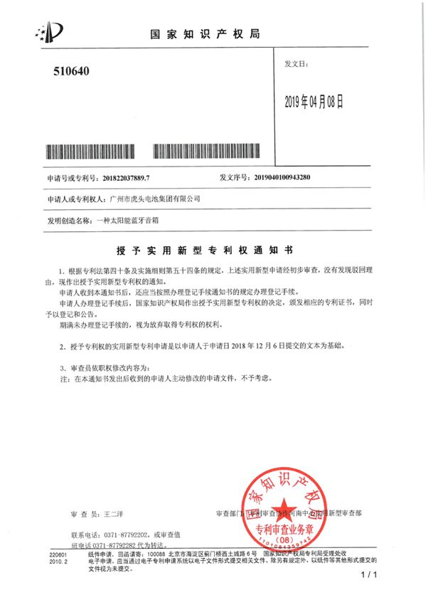 • 蓝牙音箱(太阳能)获国家实用新型专利授权