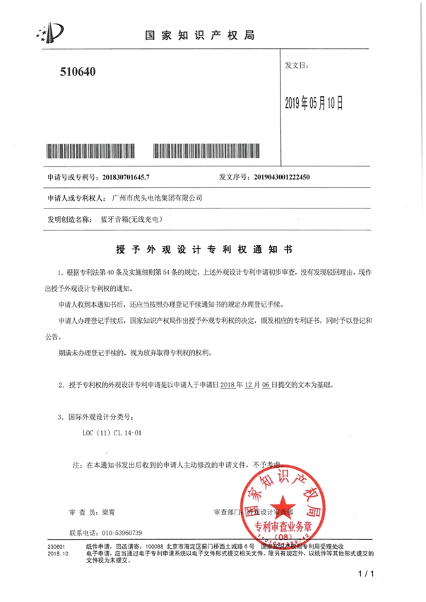 • 蓝牙音箱(无线充电)获国家外观设计专利授权