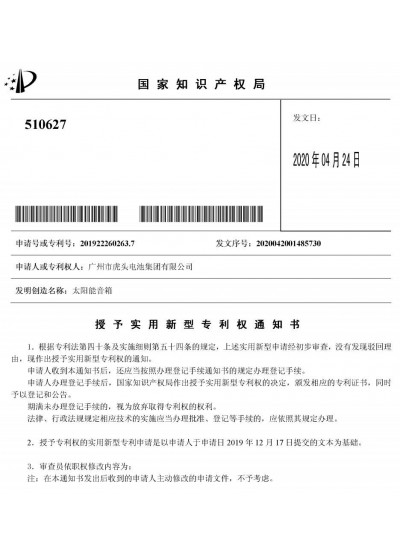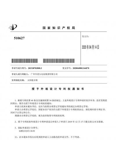 《太阳能音箱》获外观设计专...