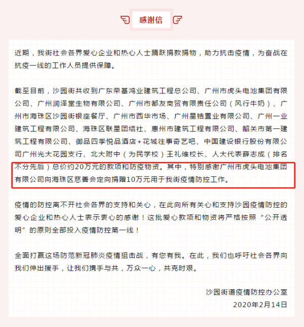 公司还积极履行社会责任,公司党委向沙园街道办事处定向捐赠10万元,为街道做好疫情防控工作贡献力量。